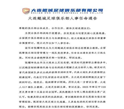 李国旭助手离队,大连难争张源张耀坤接手鲲城联手大奎冲超