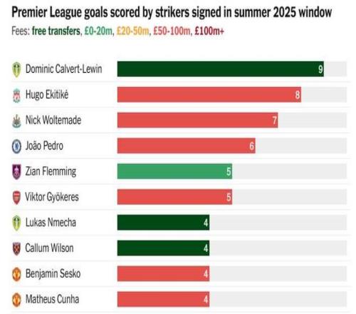去年夏窗英超转会中锋本赛季联赛进球数:
